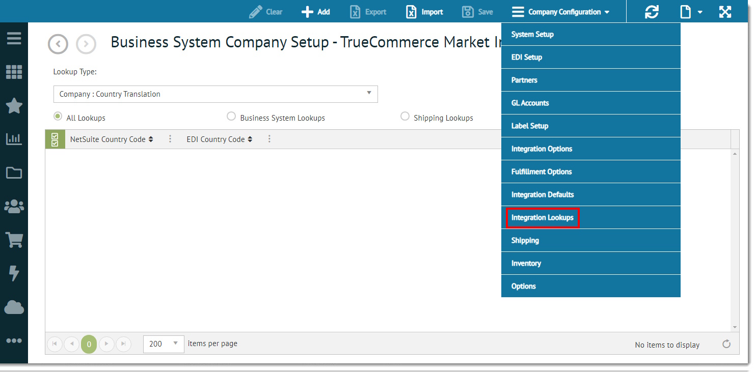 Business System Company Setup can display a list of any lookup tables that are set up to translate data between Transaction Manager and your business system. To display this page, select Integration Lookups from the Company Configuration dropdown control.