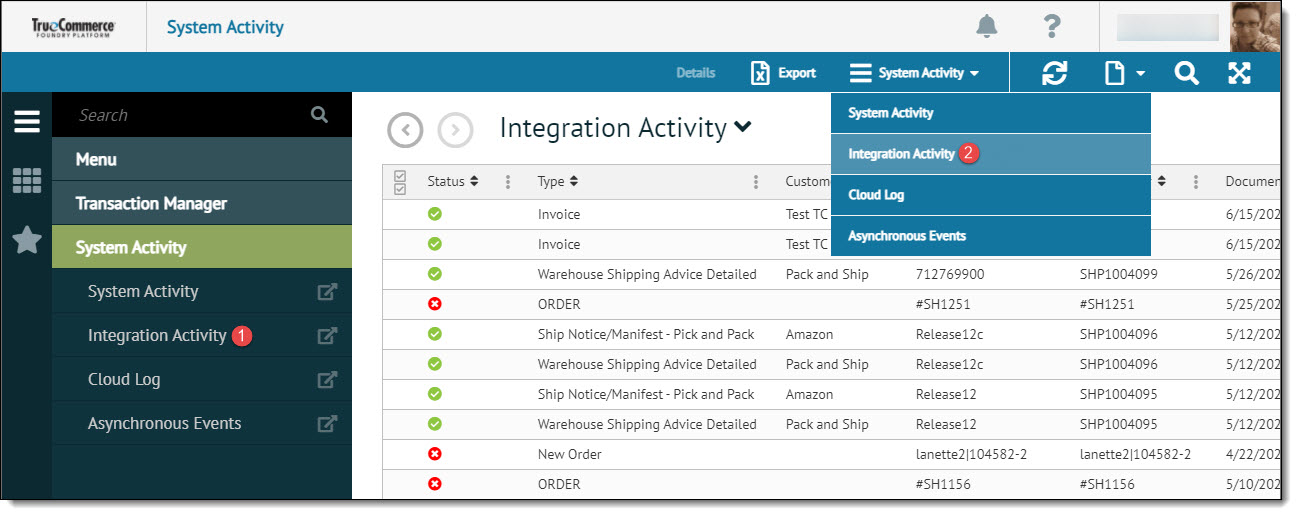 Select Transaction Manager > System Activity on the Foundry Menu, and select Integration Activity to launch the Integration Activity log.