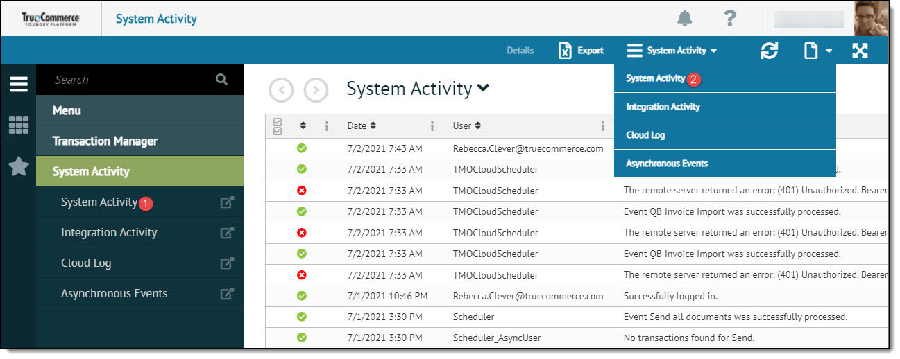 Select Transaction Manager > System Activity on the Foundry Menu, and then select System Activity to launch the System Activity log.