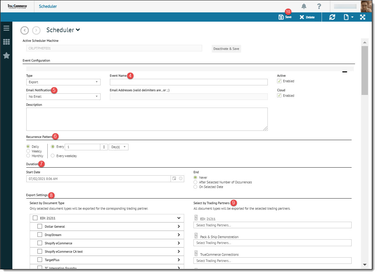 Note that when using a Cloud BSP (QuickBooks Online, Sage X3, or NetSuite), it will not be necessary to activate a scheduler machine when setting up a cloud event. In this case, the Active Schedule Machine field is grayed out.