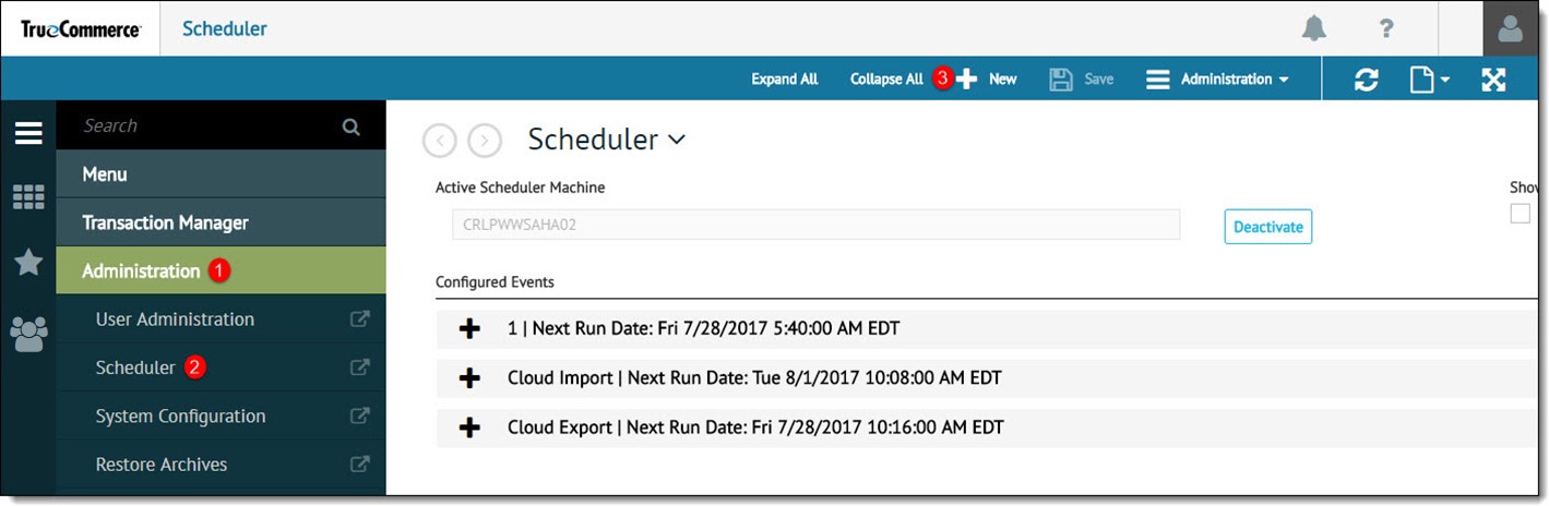 Use the Scheduler menu link or select Scheduler from the Administration dropdown control to launch the Scheduler start page.