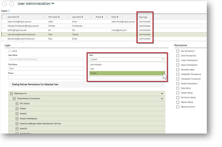 In addition, you can also limit which trading partners and document types the user has access to. See Trading Partner Permissions.