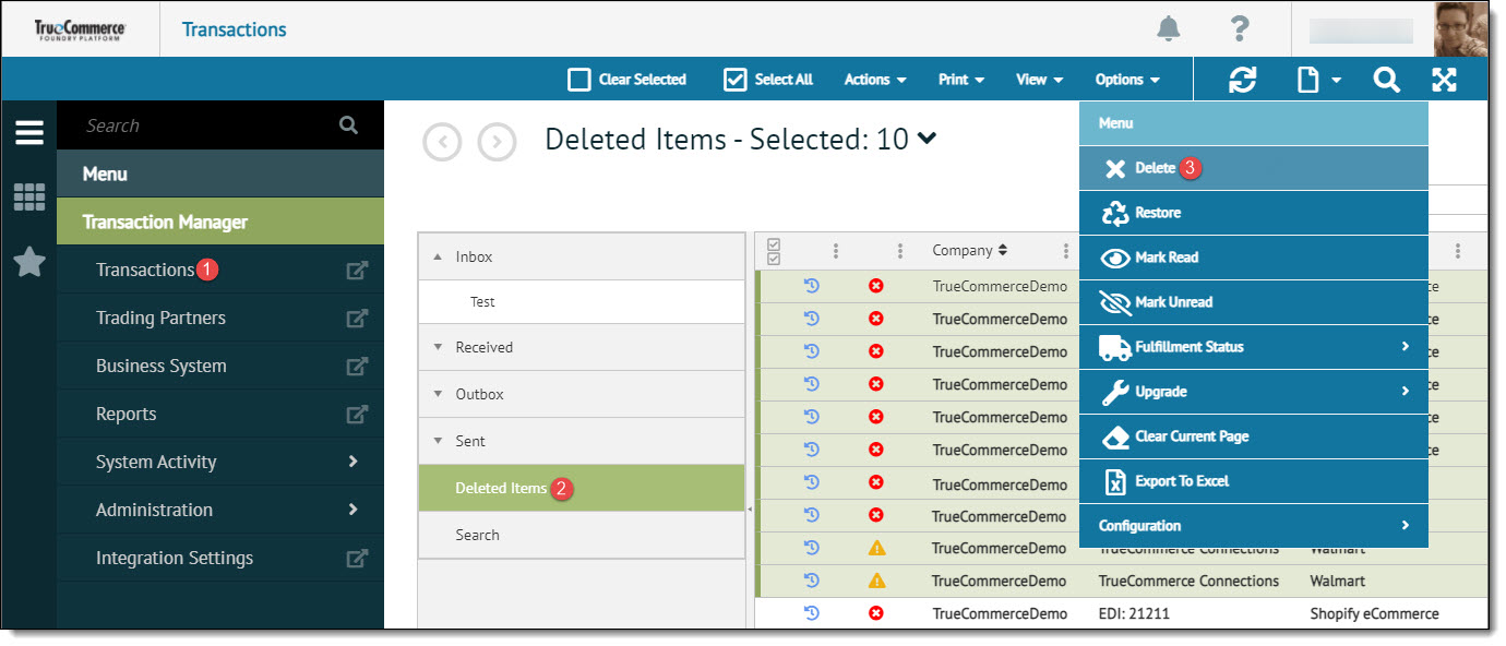 CAUTION Once you delete transactions from the Deleted Items folder, they are removed permanently and can no longer be restored to Transaction Manager. |