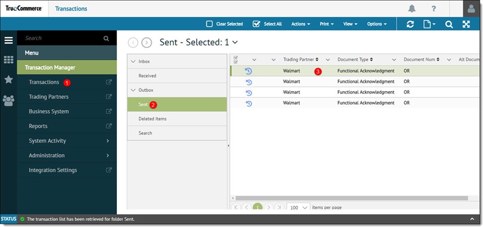Select the Sent folder from the transactions menu box.