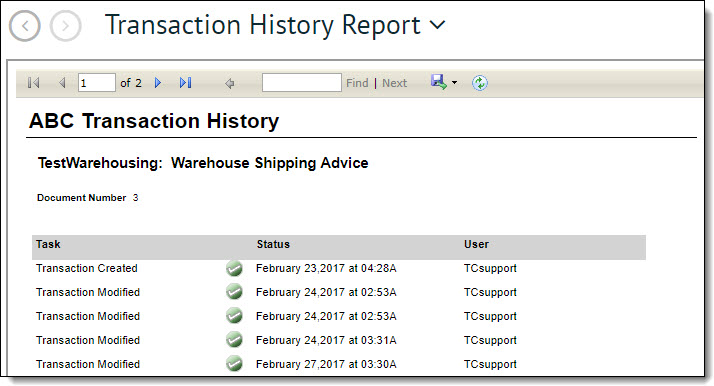 The Transaction History report provides a quick snapshot of the details of a selected document, which may include direct links to corresponding documents that have been created to complete the transaction.