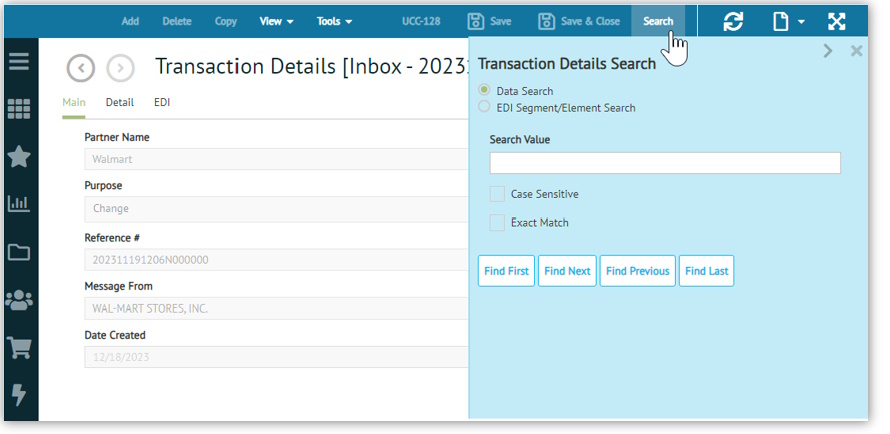 When you are in Transaction Details, you can click Search on the action bar to search the contents of the transaction selected. You might need this feature on occasion when a specific piece of data needs to be examined and/or corrected (requested by your trading partner).