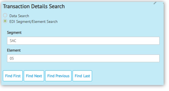 Select the EDI Segment/Element Search option to search by segment and element if you are looking for transaction details in the raw EDI. Use the 'find' controls to locate instances of the Segment and Element values in the EDI content.