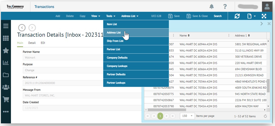 The Tools dropdown menu is enabled on the Transaction Details action bar for quick access to any of the lists, defaults, and lookup tables defined for the associated trading partner and company in Transaction Manager.