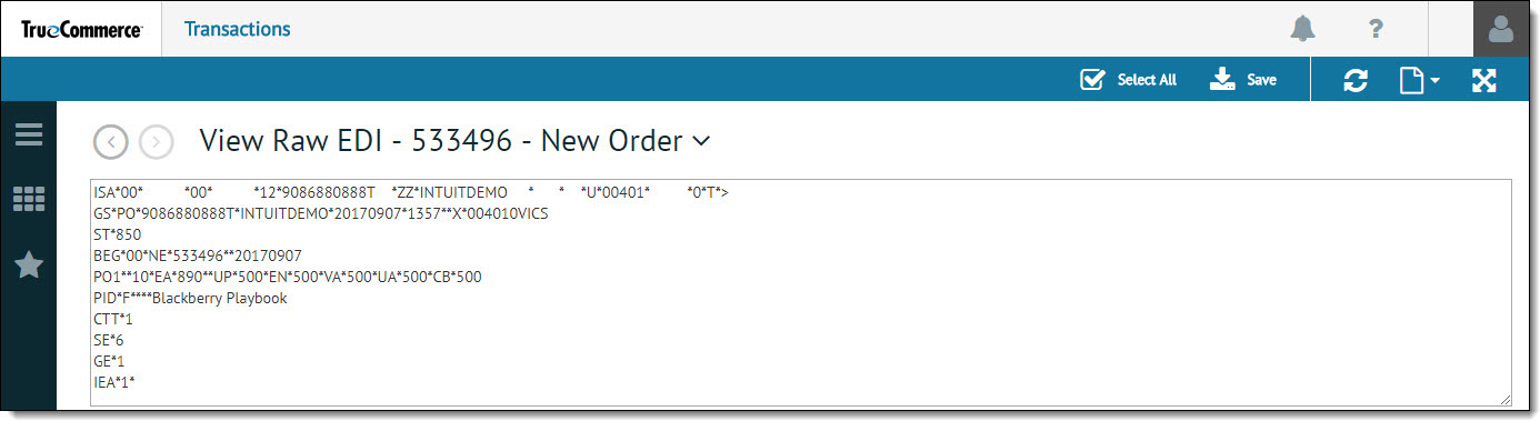 Select a transaction record and then select Raw EDI from the View dropdown control.