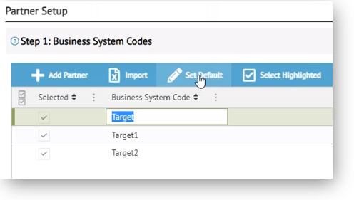 Under Step 1: Business System Codes, click Add Partner to add a new record (partner code) for each trading partner account.