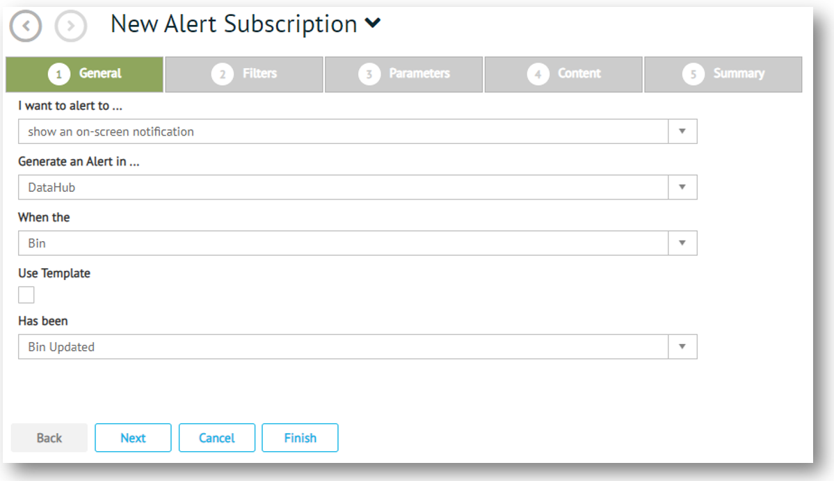 Complete each 'statement' under the General tab to establish how the alert will be delivered to the user, the application in which the alert has been triggered, and the specific event within the application that causes the alert. The remaining panels in the New Alert Subscription editor are based on the fields completed here. Note that General panel details cannot be changed once the alert has been created.