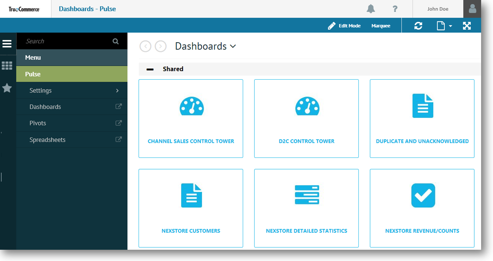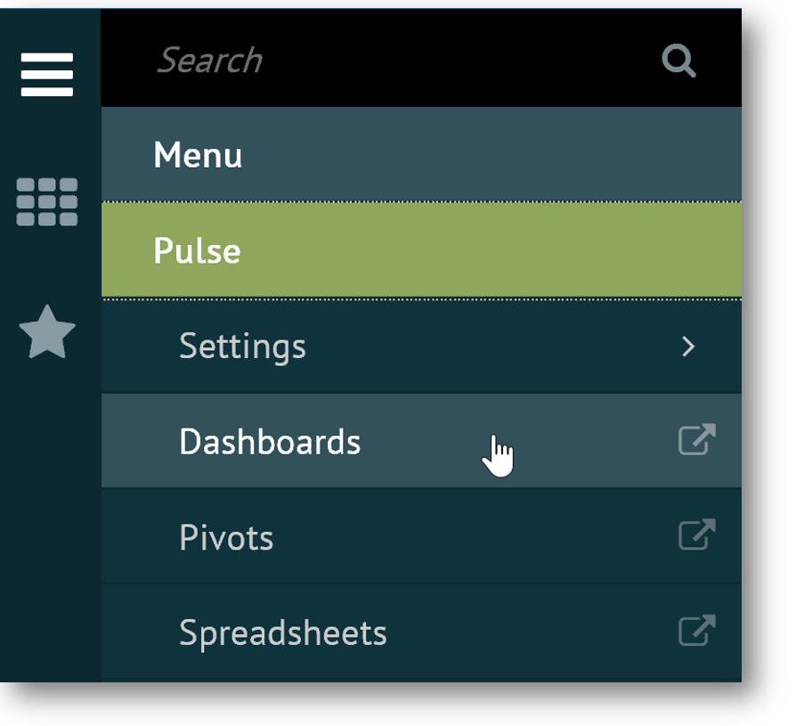 The application start page you open via the main Menu is often the the launch point for various other task pages within that application. For example, the Dashboards start page in the previous example contains a library of dashboard 'tiles' that can be used to launch the dashboard pages they represent.