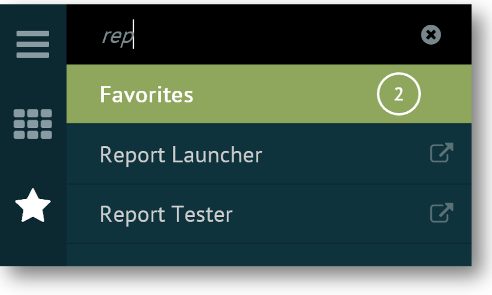 Enter text in the search box above the menu. The navigation panel immediately changes to display any spaces that match the text you are typing. Following is an example of the search results when 'rep' is entered in the search box.