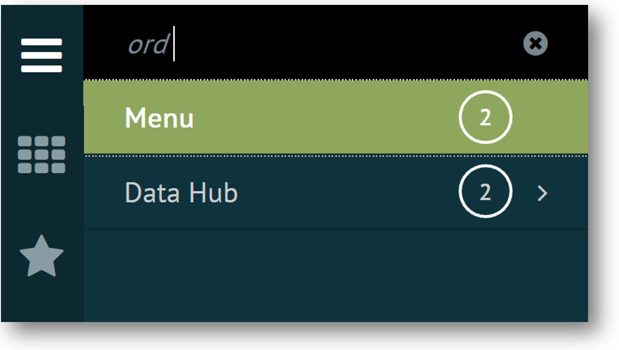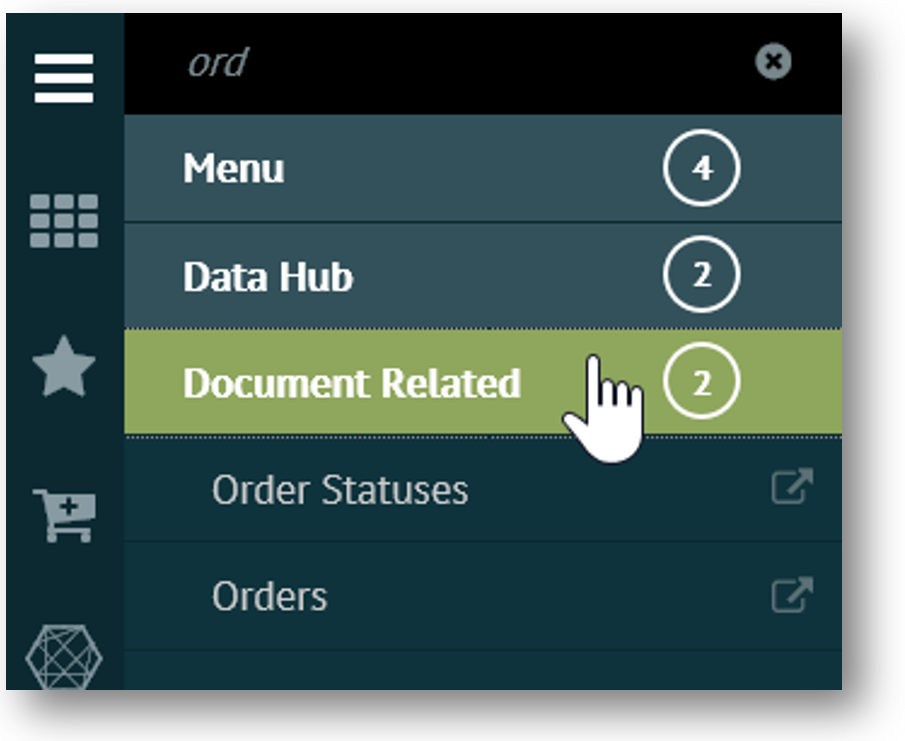 Enter text in the search box above the menu. The navigation panel immediately changes to display all menu items that match the text you are typing. Following is an example of the search results when 'ord' is entered in the search box.