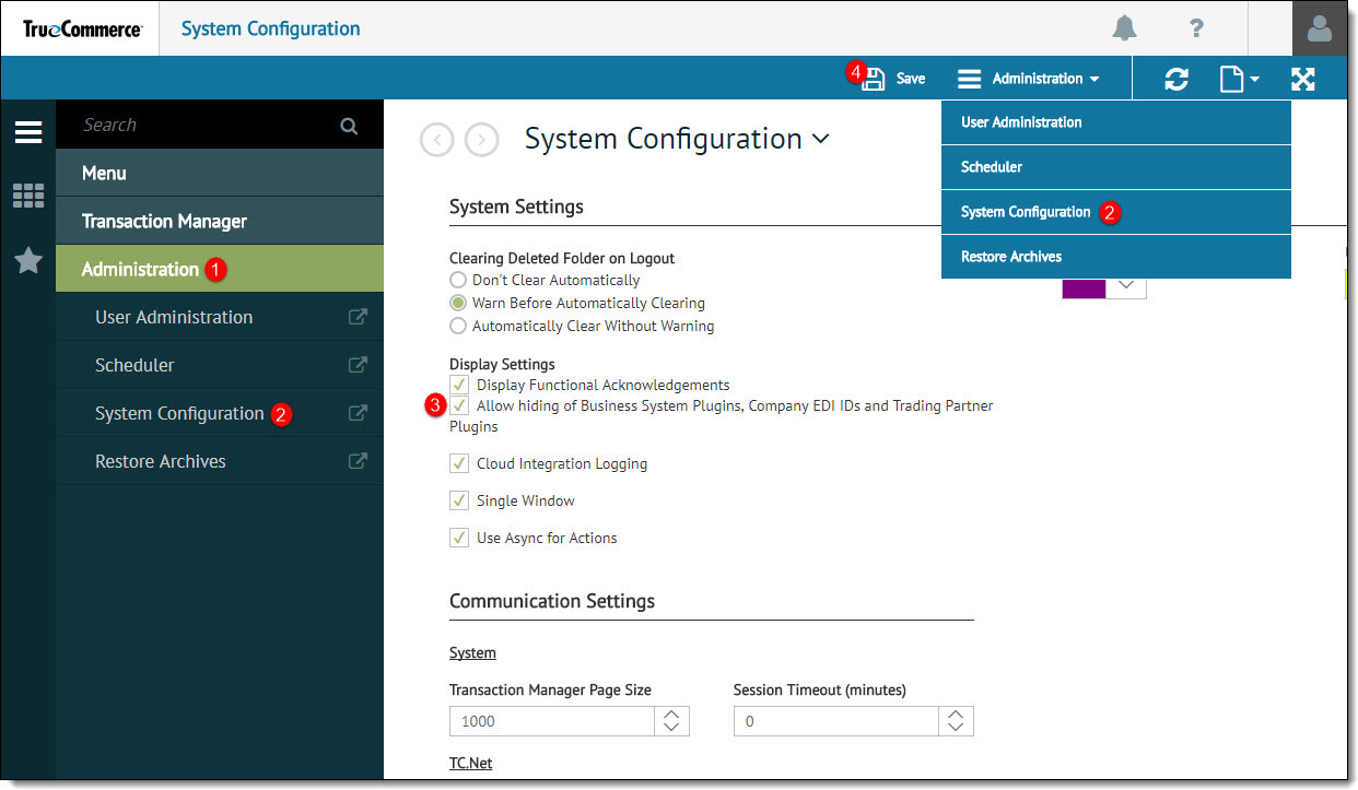 Check the Allow hiding of Business System Plug-ins, Company EDI IDs, and Trading Partner Plug-ins box.